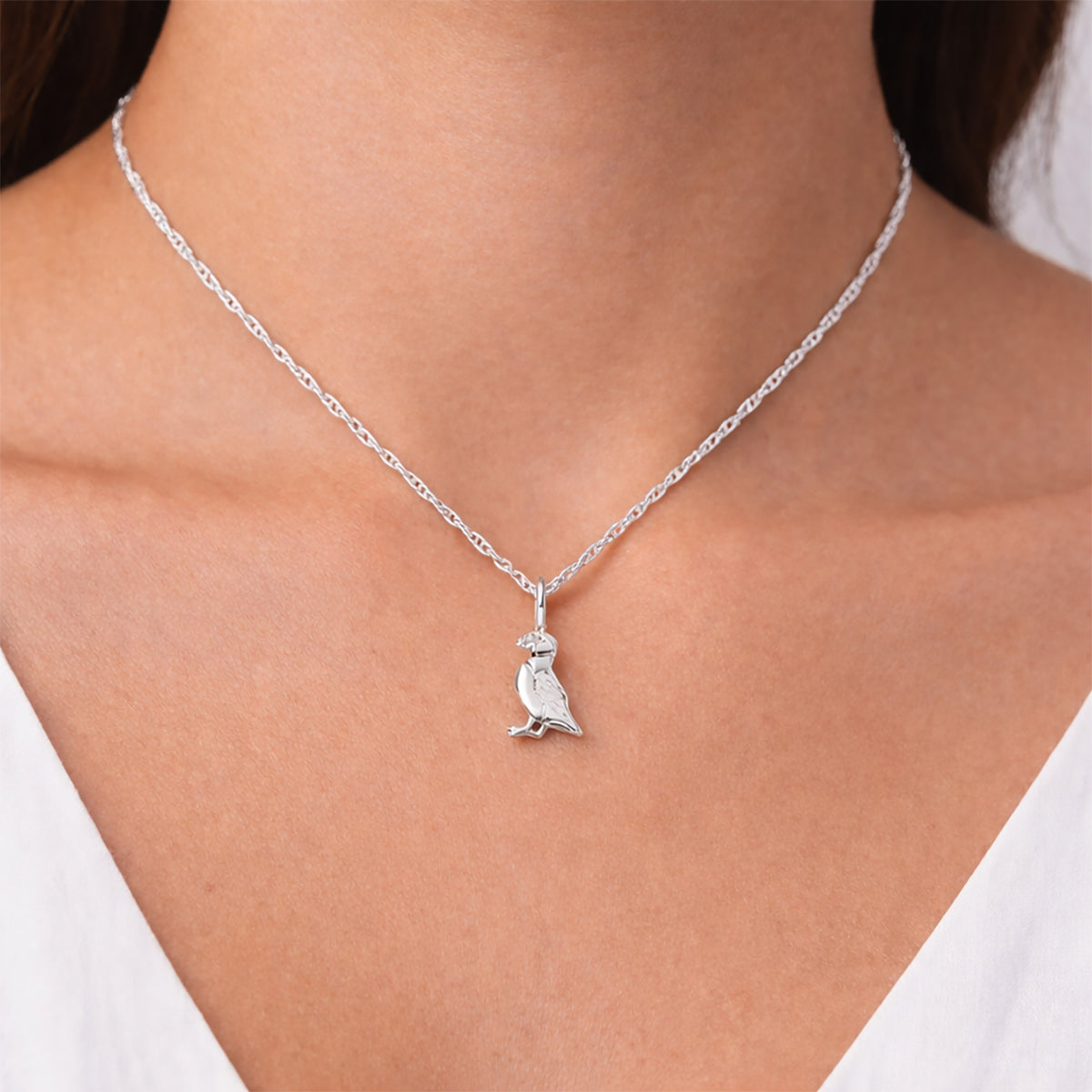 Beautiful small puffin pendant in sterling silver on a prince of wales rope chain.