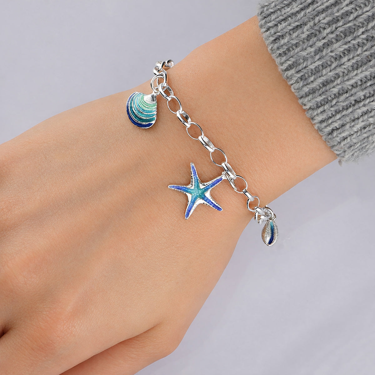 A beautiful bracelet inspired by the Orkney shoreline. The silver bracelet has a small ‘Groatie Buckie’, ‘venus shell’ and a starfish soldered onto it all hand enamelled in oceanic colourways.
