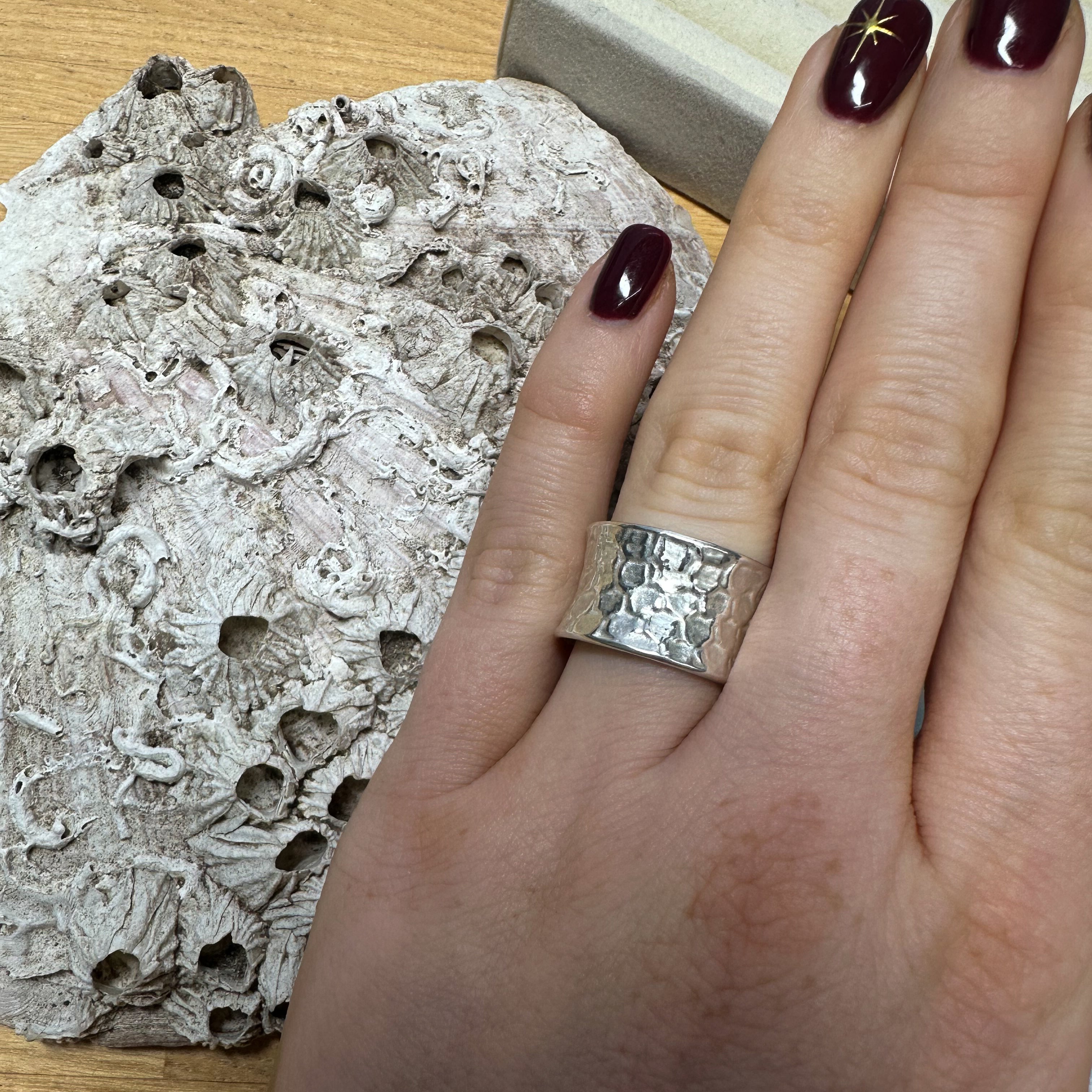 This Handstruck silver statement ring features a wide textured band that catches the light beautifully.